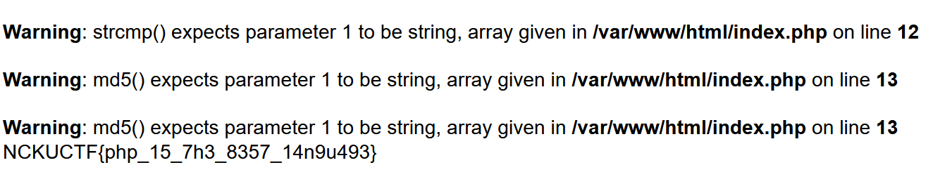 由於同為弱型別比較,嘗試輸入陣列使其報錯,即可獲得 flag。