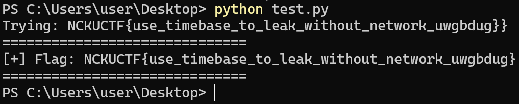 – 測試' ; grep '^NCKUCTF{' /flag # '回傳success,可以透過不斷測試爆破出flag。