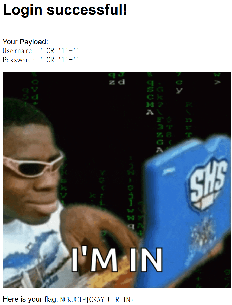 NCKUCTF{OKAY_U_R_IN}